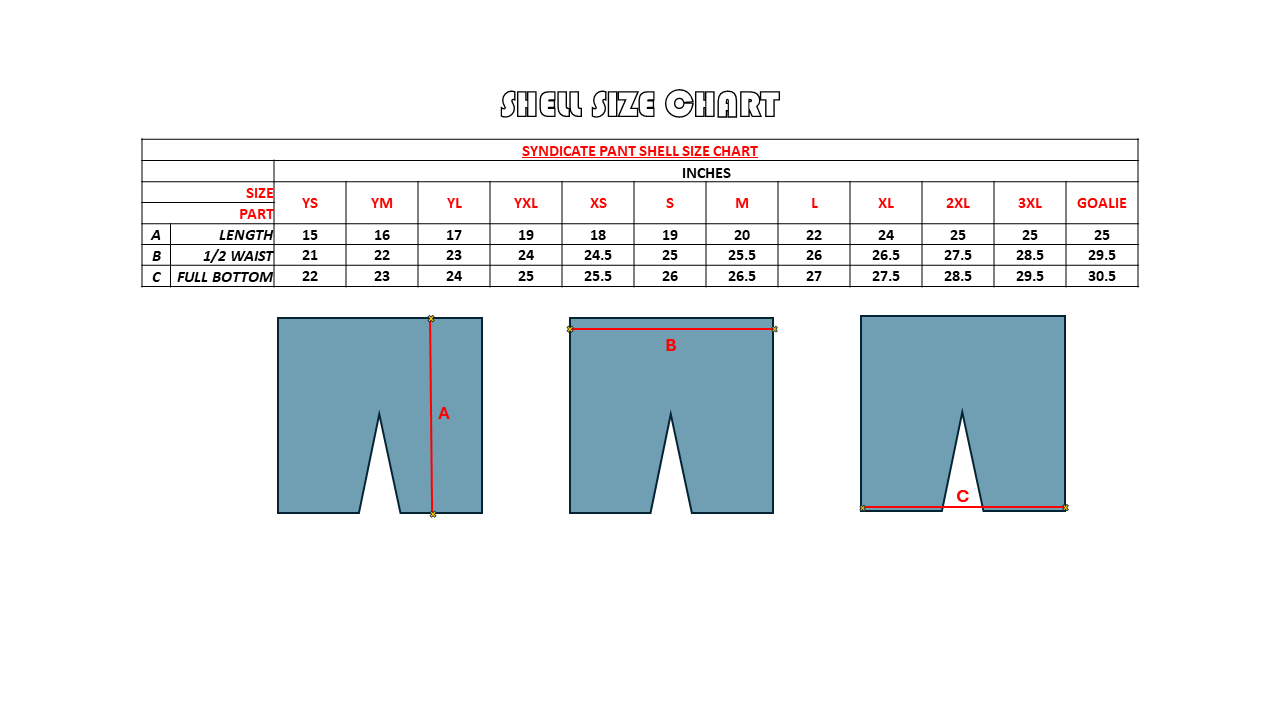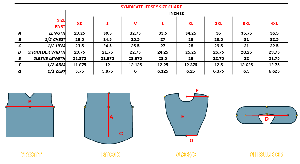 The standards are here but if you need to adjust some measurements let us know. 2XL Body with Goalie sized sleeves? No Problem.