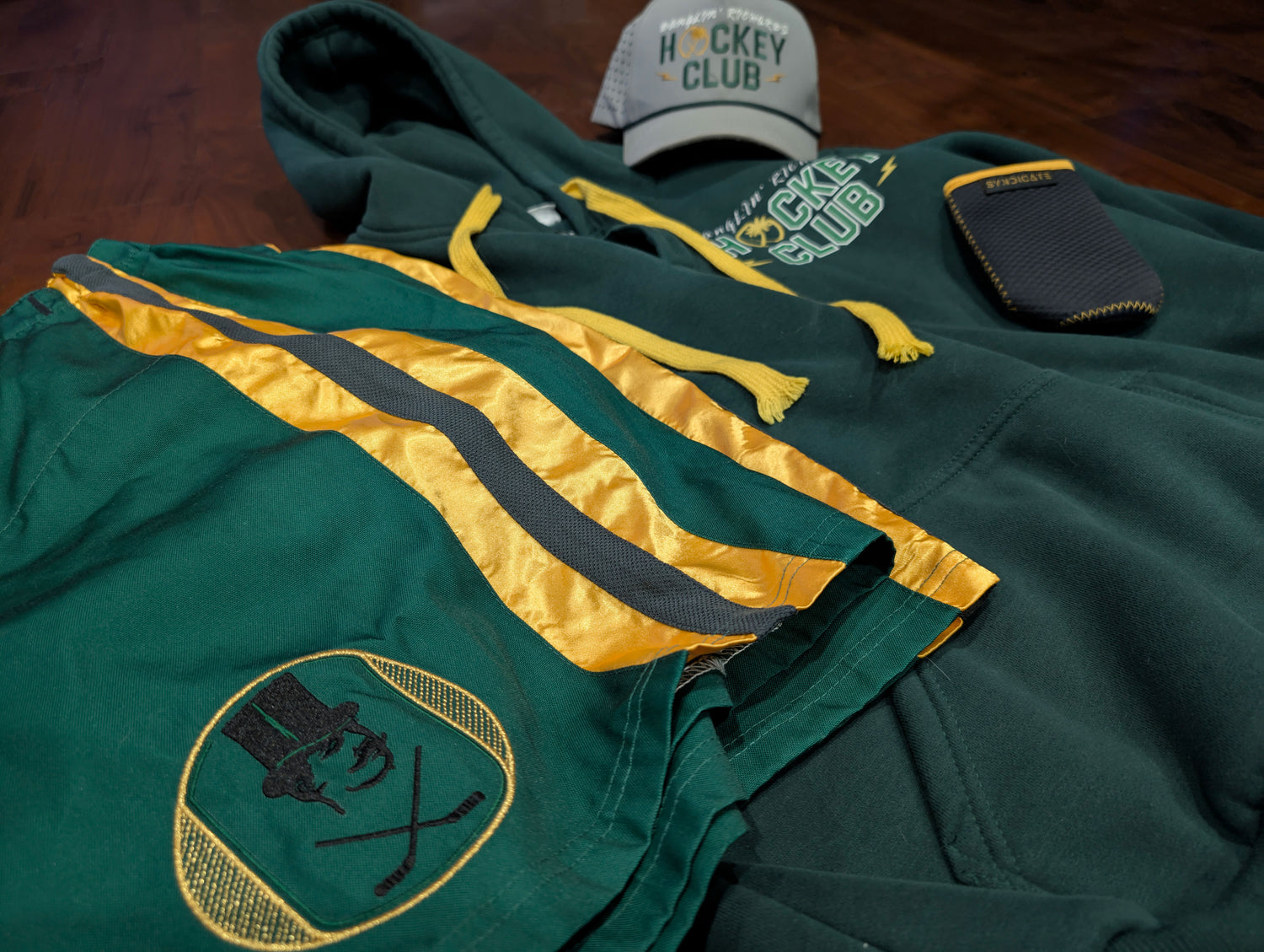 We don't quit with just the on-ice looks. The Syndicate offers options for Tracksuits, Hoodies, T-shirts, Hats, Bags, Coozies, Locker Mats, and more.
